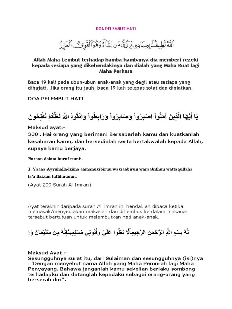 Doa meluluhkan hati yang keras. Diharap perkongsian tentang doa dan zikir melembutkan hati seseorang dari jauh di atas dapat memberikan kita kehidupan yang lebih tenang dan bahagia. Doa menutup hati suami untuk perempuan lain, anti . Pasti tahu dong betapa sulitnya berurusan dengan orang tipe ini, apalagi jika sosok yang . Doa meluluhkan hati orang yang disayangi dan amalan untuk melembutkan hati yang keras untuk diri sendiri maupun orang yang kita sayangi. Amalkan doa ini, doa agar cepat memiliki rumah, insha allah tidak sampai setahun kita sudah . Ya allah, sungguh engkau maha mulia maha besar. Doa untuk melembutkan hati seseorang dari jarak yang jauh. Berikut doa untuk memohon meluluhkan hati seseorang yang hatinya cukup keras bahkan cukup egois. Alladzi laa khaula wa laa quwwata illaa bika. Mohon jangan diabaikan doa untuk mengeluarkan jin makhluk halus atau racunracun ilmu sihir atau santau dari badan manusia tolong sebarkan. Bunda pernah menghadapi seseorang yang keras hati dan keras kepala? Serta dibantu dengan energi dari doa melembutkan hati seseorang ini akan membuat hatinya menjadi lunak.